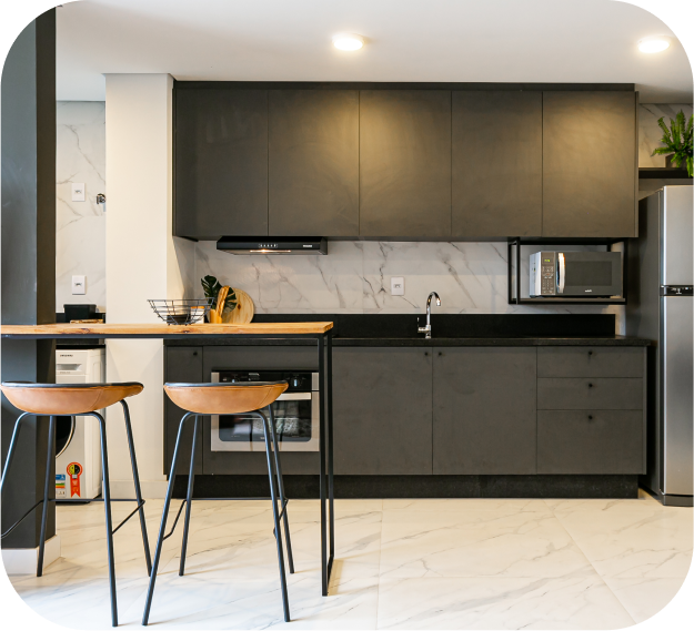 Instalamos as pedras, móveis, eletrodomésticos e utensílios, deixando o apartamento completo e equipado para morar.